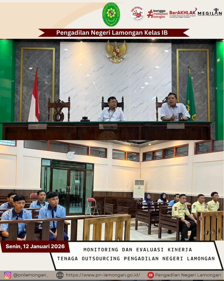 Pada hari Senin tanggal 12 Januari 2026, bertempat di Ruang Sidang Utama H. Charis Mardiyanto, S.H.,M.H. telah dilaksanakan Monitoring dan Evaluasi Kinerja bagi Tenaga Outsourcing Pengadilan Negeri Lamongan oleh Wakil Ketua PN Lamongan Bapak Yogi Rachmawan, S.H.,M.H. didampingi oleh Kasubbag Umum dan Keuangan.