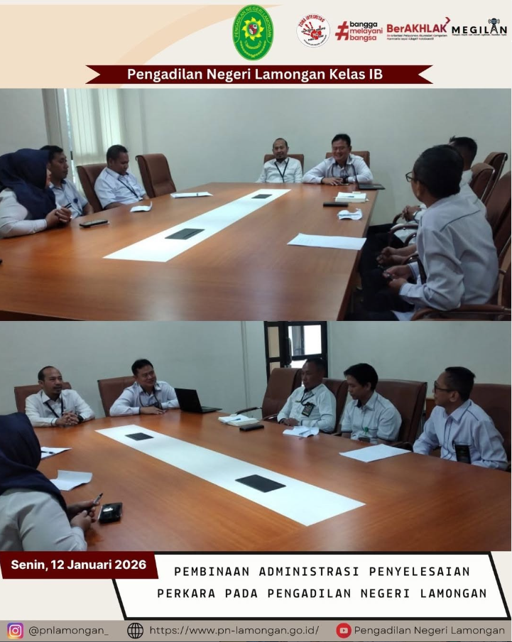 Pada hari Senin tanggal 12 Januari 2026, bertempat di Ruang Library and The Chamber of Conference Pengadilan Negeri Lamongan, telah dilaksanakan Pembinaan oleh Ketua Pengadilan Negeri Lamongan Bapak Benny Sudarsono, S.H.,M.H. bersama Wakil Ketua Pengadilan Negeri Lamongan kepada Panitera, para Panitera Muda dan Panitera Pengganti.