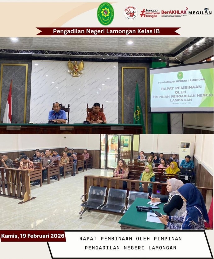 Pada hari Kamis tanggal 19 Februari 2026, bertempat di Ruang Sidang Utama H. Charis Mardiyanto, S.H.,M.H. Pengadilan Negeri Lamongan telah dilaksanakan Rapat Pembinaan oleh Ketua Pengadilan Negeri Lamongan Bapak Benny Sudarsono, S.H.,M.H. dan Wakil Ketua Bapak Yogi Rachmawan, S.H.,M.H. yang diikuti oleh seluruh Aparatur Pengadilan Negeri Lamongan.