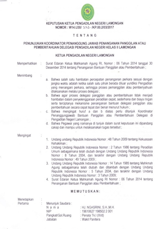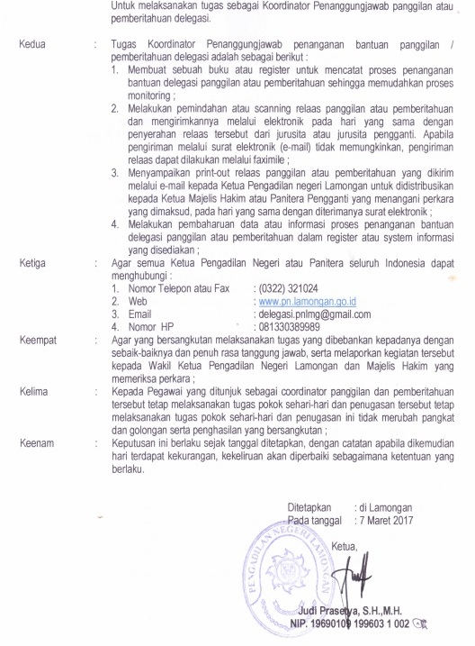 Berdasarkan Keputusan Ketua Pengadilan Negeri Lamongan Nomor : W14.U30/222/KP.00.2/03/2017 tentang Penunjukkan Koordinator Delegasi dan Panggilan pada Pengadilan Negeri Lamongan, maka dengan ini menunjuk :