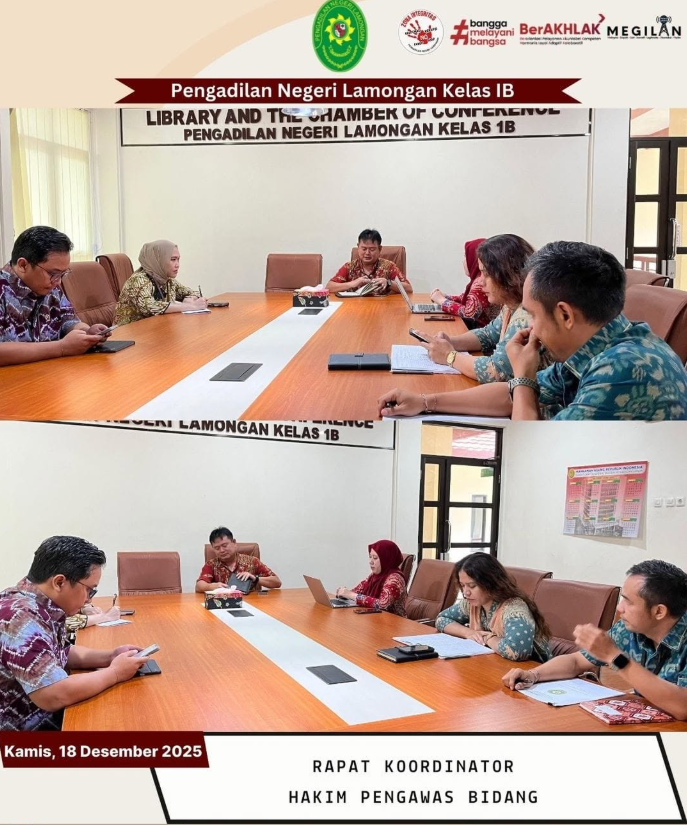 Pada hari Kamis, tanggal 18 Desember 2025, bertempat di Ruang Library and The Chamber of Conference (LCC) Pengadilan Negeri Lamongan, Wakil Ketua Pengadilan Negeri Lamongan Bapak Yogi Rachmawan, S.H.M.H. sebagai Koordinator Pengawas Bidang beserta para Hakim melaksanakan Rapat Koordinasi untuk membahas hasil pengawasan oleh para Hakim Pengawas di masing-masing bidang di Pengadilan Negeri Lamongan.