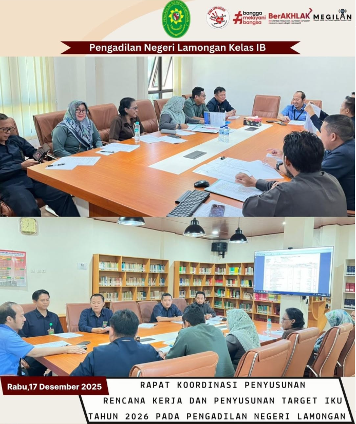 Pada hari Rabu, tanggal 17 Desember 2025, bertempat di Ruang Library and The Chamber of Conference Pengadilan Negeri Lamongan, Ketua Pengadilan Negeri Lamongan Bapak Benny Sudarsono, S.H.M.H. beserta Wakil Ketua, Panitera, Sekretaris, para Panitera Muda dan para Kasubbag Pengadilan Negeri Lamongan melaksanakan Rapat Koordinasi Penyusunan Rencana Kerja dan Penyusunan Target Indikator Kinerja Utama (IKU) Tahun 2026 pada Pengadilan Negeri Lamongan. Rapat Penyusunan Indikator Kinerja Utama (IKU) merupakan salah satu upaya Pengadilan Negeri Lamongan untuk mewujudkan kinerja pelayanan Pengadilan yang lebih baik yang nantinya akan diterapkan dalam operasional. Dalam rapat, para peserta membahas berbagai aspek yang menjadi fokus IKU, antara lain peningkatan penyelesaian perkara, pelayanan publik yang prima, penguatan integritas aparatur serta efisiensi pengelolaan anggaran.