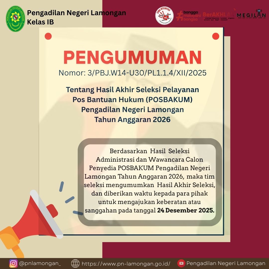 Pengumuman Hasil Akhir Seleksi Pelayanan Pos Bantuan Hukum (POSBAKUM) Pengadilan Negeri Lamongan