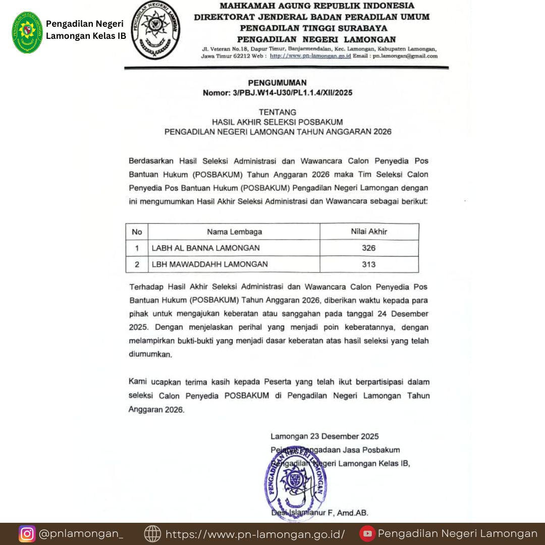 Pengumuman Hasil Akhir Seleksi Pengadaan Jasa Pos Bantuan Hukum (POSBAKUM) pada Pengadilan Negeri Lamongan Tahun Anggaran 2026.