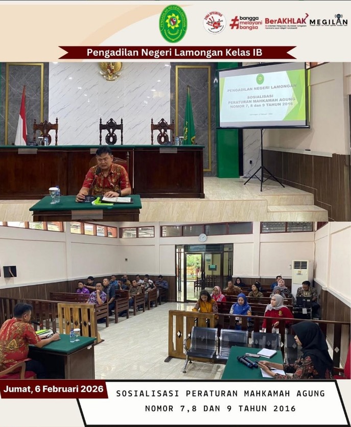 Pada hari Jumat tanggal 6 Februari 2026, bertempat di Ruang Sidang Utama H. Charis Mardiyanto, S.H.,M.H. Pengadilan Negrri Lamongan telah dilaksanakan Sosialisasi Peraturan Mahkamah Agung RI Nomor 7 tentang Penegakan Disiplin Kerja Hakim pada Mahkamah Agung dan Badan Peradilan di Bawahnya, Nomor 8 tentang Pengawasan dan Pembinaan atasan langsung di lingkungan Mahkamah Agung dan Badan Peradilan di bawahnya dan Nomor 9 Tahun 2016 tentang Pedoman Penanganan Pengaduan di Mahkamah Agung dan Badan Peradilan di bawahnya.